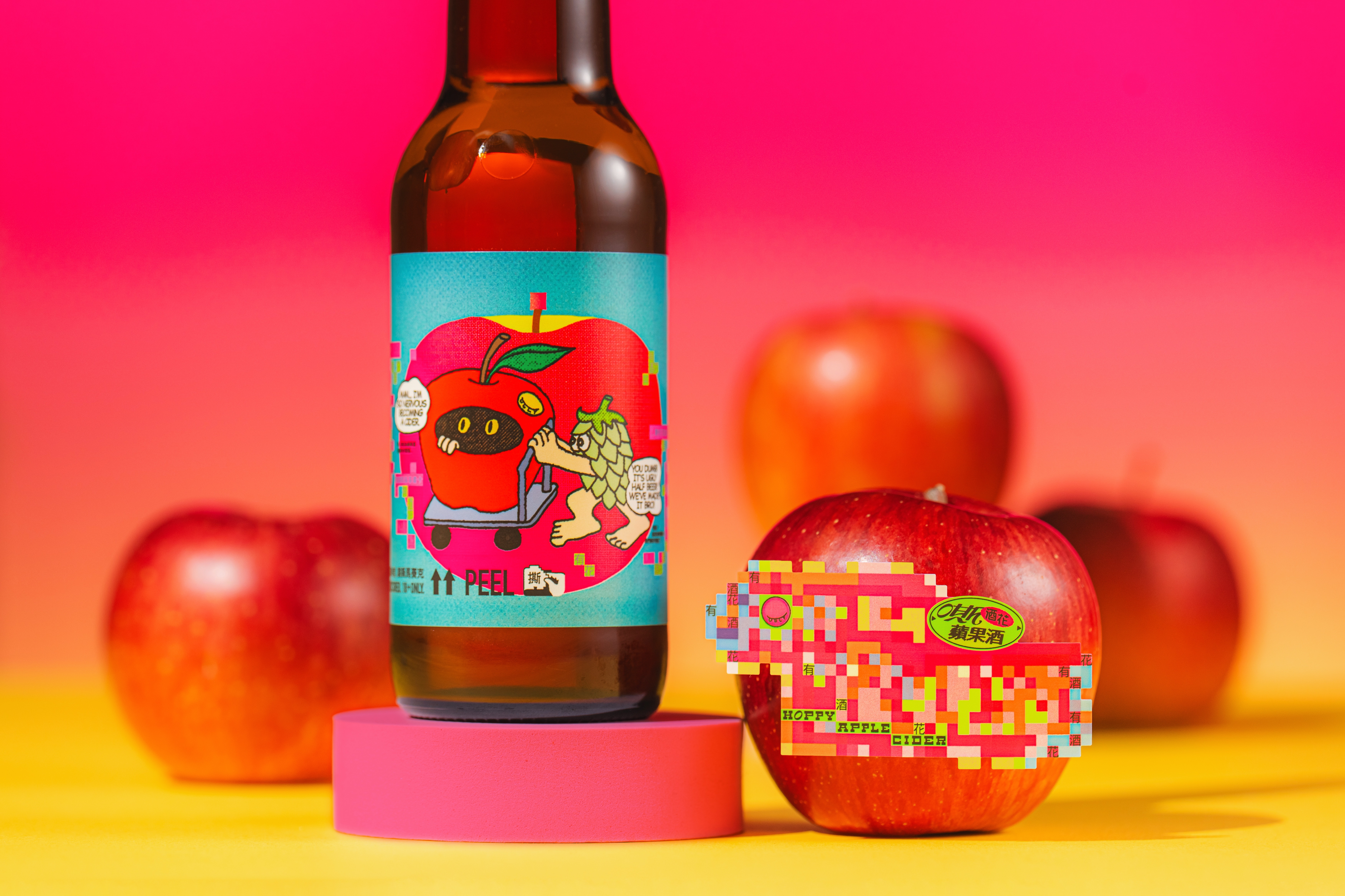 在這次酒花蘋果酒的換裝設計中,林梣精準捕捉了面對「轉變」時,那種既忐忑又充滿期待的複雜情緒。僅透過單一畫面,搭配蘋果與啤酒花之間的擬人對話,便將這款酒豐富的「內心戲」淋漓盡致地傳達。