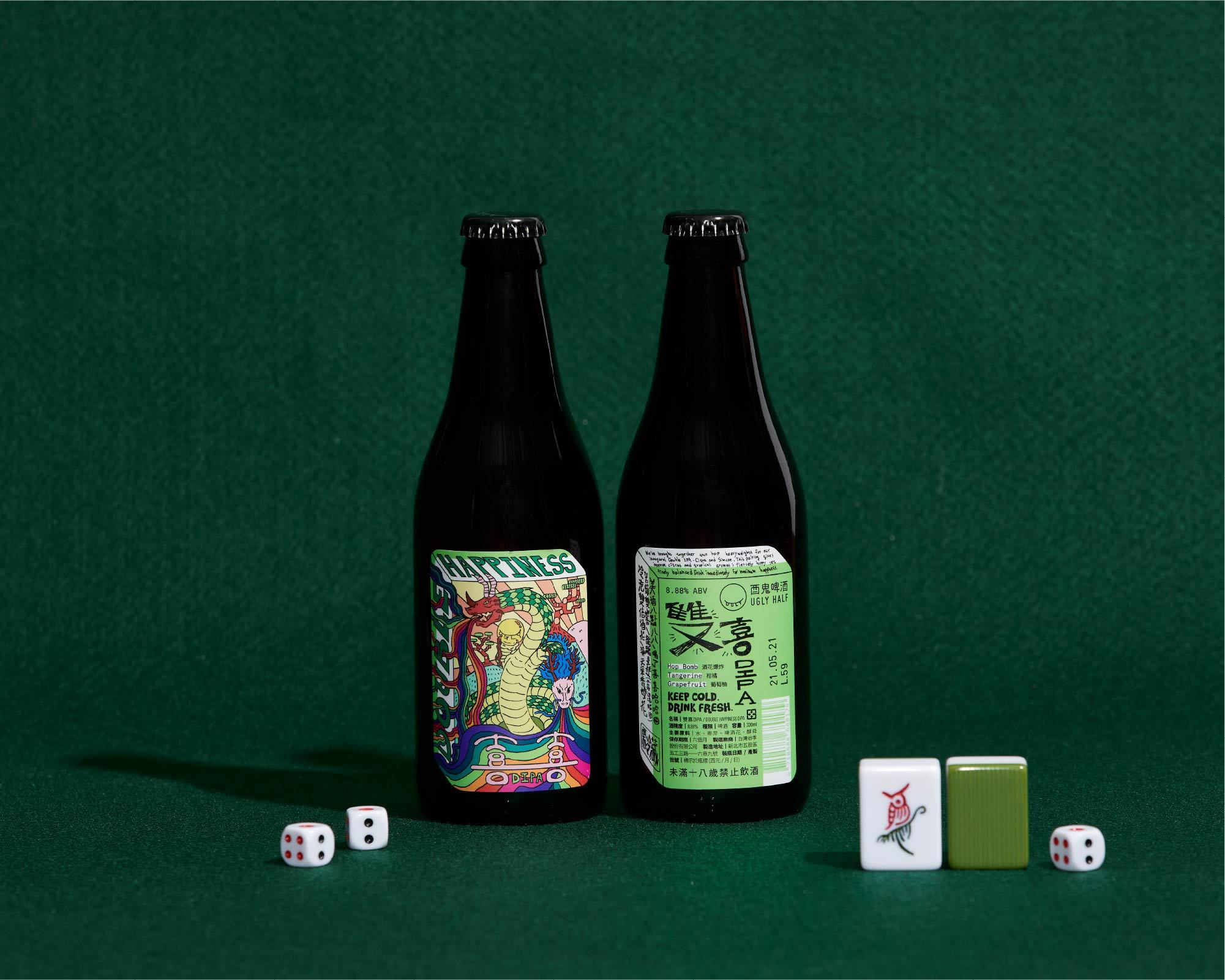 總是馬不停蹄地創作,藉以為內心帶來和平的「和平製品 Paxipro」,從畫圖寫字到設計企劃皆一人打理。作為以個人為單位的創作者,不受風格限制、視覺主題多樣,仍在不斷探索未來的各式可能。雙喜 Double Happiness DIPA 以麻將底蘊為創作命題,手繪線條雙喜強調全新現代的東方喜慶感。一索麻雀化身翱翔廟宇的祥瑞雙龍,一字排開威震八方。
