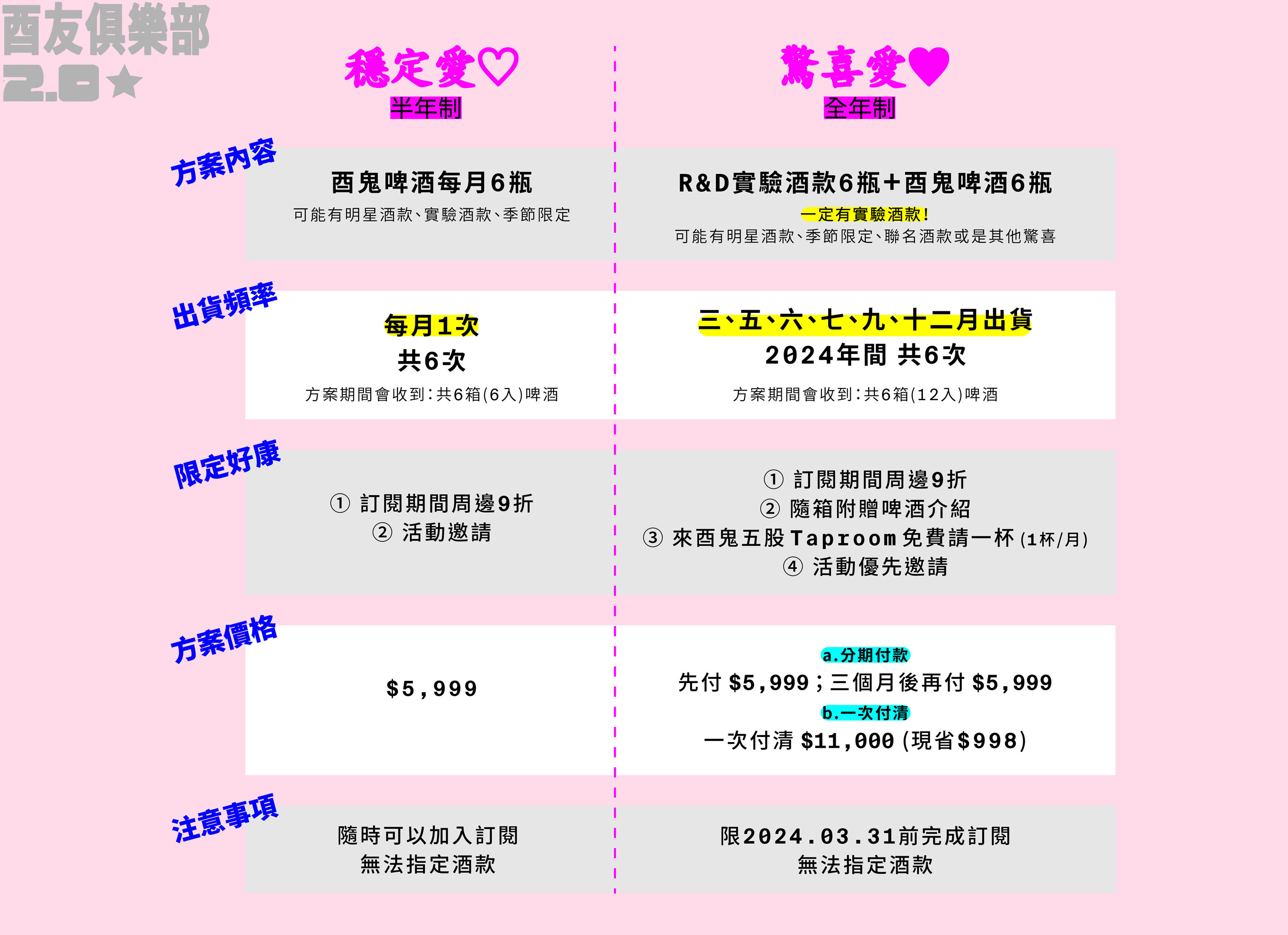 ❶ 酉鬼啤酒【 十二入 驚喜愛】會於 R&D 實驗酒款裝瓶當週寄出訂閱箱;【 六入 穩定愛】將會於每月月底寄出訂閱箱,收到啤酒日期與時間依照物流運送安排,無法指定時間。